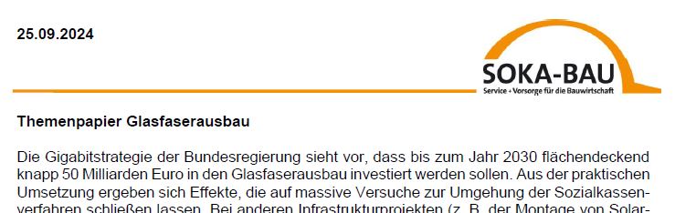 Hintergrund für diese Erarbeitung: vermehrt sind osteuropäische Entsendebetriebe für spanische Auftraggeber im Bereich des Telekomnetzes tätig, die Arbeitsverhältnisse rotieren häufig und es erfolgt keine ordnungsgemäße Teilnahme an den Bau-Sozialkassenverfahren. Was in diesem Papier fehlt, ist, dass im Bereich Kabellegung auch Elektro-Firmen arbeiten können, die im Elektrohandwerk organisiert sind und somit nicht der SOKA unterliegen. Diesen Punkt haben wir der SOKA mitgeteilt. Ob das unter Punkt 3c) beschriebene Ziel, Telekommunikationsunternehmen als Unternehmer im Sinne gemäß AentG §14 zu definieren, Umsetzung finden kann, ist fraglich. Dennoch wurde dieser Vorschlag unterbreitet und würde uns bei Erfolg einiges erleichtern.